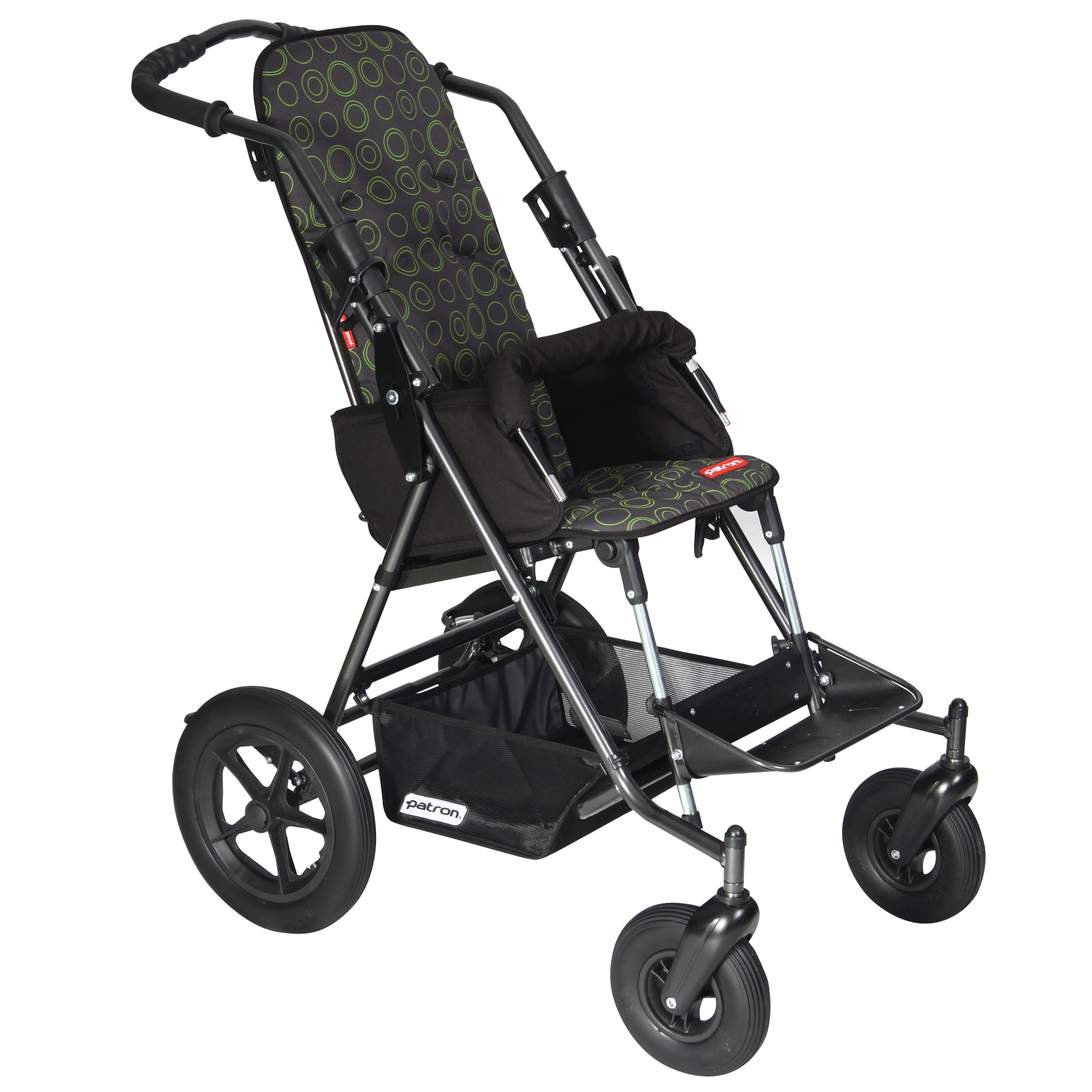 Robustní podvozek s ergonomickým tvarem rukojeti a velkými koly o průměru 300 mm (200/300 mm) s terénním vzorem. Je základem další typové řady standardních zdravotních kočárků BEN.